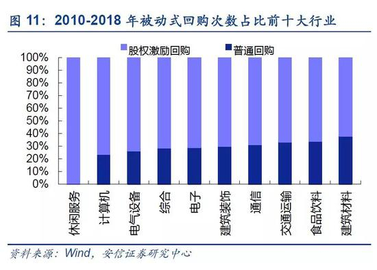 从行业角度看,休闲服务、计算机、电气设备、综合、电子等15个行业的被动式回购次数占比超过了50% ,而休闲服务、综合、建筑装饰这三个行业的被动式回购金额占比也超过了50%。