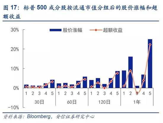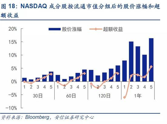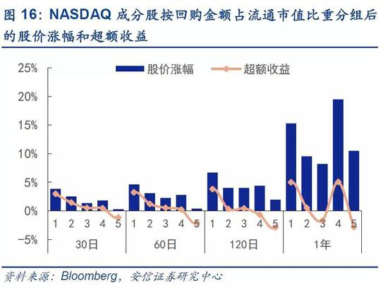 市值较小的股票由于基数更小,回购股票后对于EPS的提升更为显著,因此对于股价的提振效果往往也更加明显。无论是在标普500或NASDAQ综合指数成分股中,小市值组的股票在发生回购之后的股价表现和超额收益均相对于大市值股票有一定的优势。