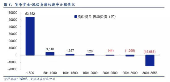 为了进一步分析,我们将全体上市公司按照差值(货币资金-流动负债)从高到低进行排序,每500个分为一组,可以看到前500名上市公司共约5.4万亿,而2000名后的三组为负值。从资本角度出发,可以发现回购能力呈现头部化趋势。