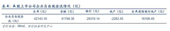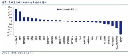 截止2017年年报,整体上市公司拥有企业自由现金流4.2万亿。分行业看,银行和非银持有企业自由现金流较多,共计持有4.18万亿,石油石化、煤炭、食品饮料、通信、建筑、钢铁、建材、家电等也拥有较多的自由现金流。地产、公用事业、电子、交运、电力设备等行业的自由现金流情况比较紧张。