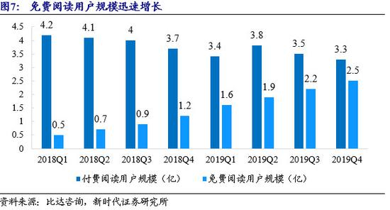 近年各大互联网巨头开始布局免费阅读,免费阅读规模迅速增长,由 2018Q1仅 0.5 亿人增长至 2019Q4 的 2.5 亿人。免费阅读模式下,内容本身不收取费用,内容提供方通过 APP 页面广告进行变现。免费阅读兴起对传统付费模式产生一定冲击,但免费阅读更多是一种差异化竞争,两种模式用户重合度低。免费阅读的兴起有助于行业吸引更多用户,付费+免费融合的模式有望成为新的发展方向,丰富行业变现方式,提供新动力引擎。