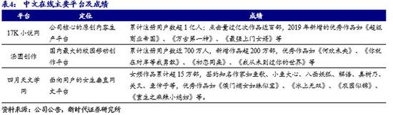 内容平台持续输出优秀作品。中文在线原创平台包括17K小说网、汤圆创作、四月天文学网。17K小说网为公司核心的原创内容生产平台,累计注册用户数超1亿人,过亿点击量作品近百部。汤圆创作是国内最大的校园移动创作平台,累计注册用户数近700万人。四月天文学网是一个面向用户的女生垂直网文平台,女频作品累计超15万部。