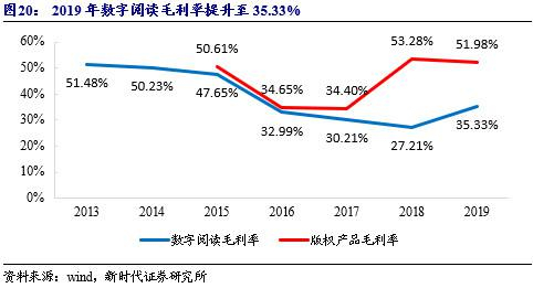 数字阅读毛利率显著提升,版权产品毛利率稳定。基于公司付费与免费阅读模式相结合的运营策略初见成效,数字阅读毛利率上涨至35.33%;2019年版权产品毛利率51.98%,趋于稳定。