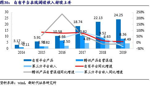 在线阅读营收略有下降,版权运营收入增长341%。2019年在线阅读业务营收达37.1亿元,同比下降3.08%,自有平台产品保持上升趋势,腾讯产品自营渠道及第三方平台收入同比下降。版权运营业务营收由2018年10.03亿元大幅增至44.23亿元,同比大幅增长340.98%,增长主要来自新丽传媒合并及版权相关业务增长。