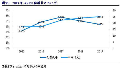 2019年MAU、MPU分别为2.2亿人、980万人,ARPU值上升至25.3元。2019年MAU达2.2亿人,同比增长2.9%,MPU980万人,同比下降9.26%。部分腾讯产品改变其用户分配策略,推广免费阅读,较少推广在线付费阅读内容,并且有更多用户被分配至阅读免费内容,使得MAU增速下降,MPU同比减少。受此影响,付费比率由2018年的5.1%下降至2019年的4.5%。ARPU值由2018年的24.1元上升至2019年的25.3元,体现内容运营、推荐体系、内容分发的全方位加强。