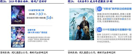 IP全产业链开发布局取得关键性突破。2019年阅文与多家文娱行业主要发行方和内容制作方完成约160部网络文学作品IP授权,并相继推出了《崩坏星河》、《萌妻食神》、《武动乾坤》等优质动画作品、首部国内上映电竞题材动画电影《全职高手之巅峰荣耀》、联合出品影视剧《黄金瞳》等,均广受关注和欢迎,其改编的自营手游《新斗罗大陆》荣获2019金陀螺“年度人气IP游戏奖”和2019金葡萄“最受关注游戏奖”等众多奖项。
