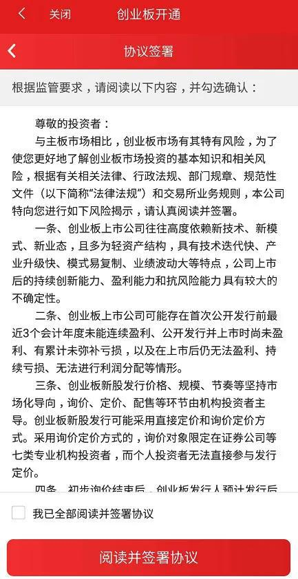 甭管是线上还是线下签署,投资者在签风险揭示书以前,都应当认真阅读,充分了解创业板投资风险。