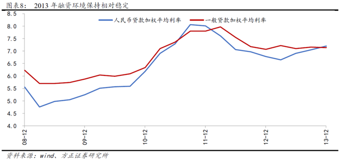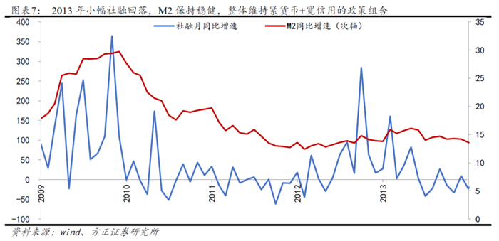 2013年成长牛行情起步于流动性宽裕格局下,相对稳定的流动性环境对成长牛的起步形成呵护与加持。经过了2012年的两次降准和两次降息,市场流动性维持了宽裕格局,2013年成长牛行情起步于流动性宽松状态下,特别是在第一次钱荒之前,流动性的充裕也对成长风格的业绩预期向好形成了支撑和呵护。全年来看,货币政策相对稳健、流动性缓慢收紧,融资成本小幅上行。其中货币工具使用方面,在2013年全年并未进行过降准降息或者升准升息的操作;在市场流动性层面,伴随着压缩非标与清理影子银行,社融增速发生了较大幅度的下滑,甚至出现过数次为负的情形,此外M2同比增速也处在缓慢下滑的大趋势下;融资成本层面,成本的变动幅度相对缓和,下半年后融资压力出现一定幅度的上行,但整体也保持了相对稳定。
