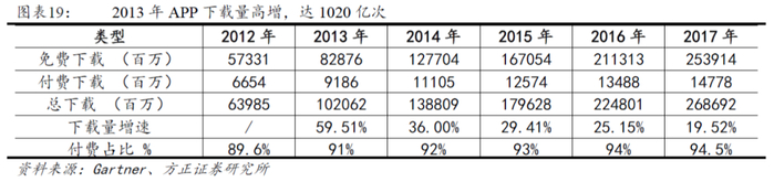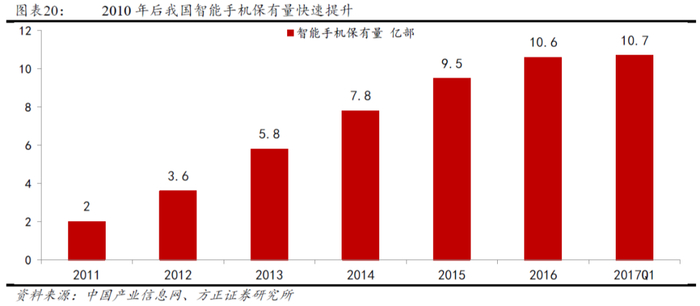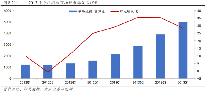 普及率提升后,下游应用迎来爆发。智能手机经过三年的集中放量后,普及率快速提升,内容端首先迎来爆发,2013年成为手游元年、国产电影元年、视频付费元年。2013年手机网络游戏用户数突破3.1亿,手机网络游戏市场规模全年保持了30%以上的季度扩张速度,全年市场规模达到139.19亿,相比2012年的53.27亿增幅超过160%。随着游戏市场的火热,游戏产品分发渠道竞争也同步升级,2013年再融资与并购重组均处于宽松周期,年内A股上市公司出现6家游戏渠道公司并购,涉及金额达128亿元,移动互联网的重要商业逻辑得到确认。2013年全国总票房217.69亿元,同比增长27.51%。全年内地上映电影305部,其中60部电影票房过亿,国产片占到了33部。国产影片票房127.67亿元,同比增长54.32%,占比58.65%,国产片占比开始超过进口片。与之相伴随的视频领域市场规模同样进入快速扩张阶段,移动互联网及新媒体的出现为内容领域打开了市场空间,产业重心由硬件向内容及应用领域延伸。