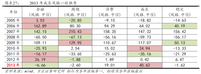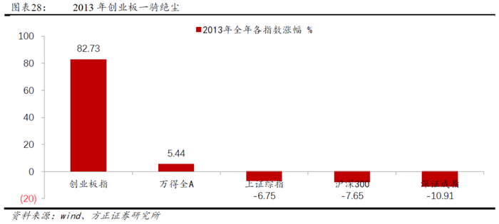 1、2013年是极端演绎的成长牛市,成长风格一骑绝尘,全年创业板涨幅为82.73%,而沪深300指数下跌7.65%;