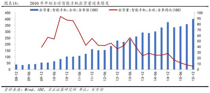 2013年产业重心向下游内容领域延伸,产业趋势及商业逻辑得到确认。2010年是移动互联网产业趋势确立的元年。2009年11月3日,温家宝总理发表《让科技引领中国可持续发展》的讲话,正式提出七大战略新兴产业。其中新一代信息技术包括了新一代宽带移动通信、物联网、下一代互联网、云计算、三网融合等。同年我国3G牌照正式下发,通信领域基础设施建设加速。2010年iPhone4的推出具有划时代的意义,标志着智能手机时代的到来,全球移动互联网的产业趋势也由此正式确立。此后全球智能手机出货量连续多年快速增长,带动费城半导体指数以及全球半导体销售额走高。2013年,伴随着《愤怒的小鸟》《水果忍者》等一系列游戏的爆火,手游开始爆发。2013年春节档《泰囧》突然爆发,以12.67亿人民币最终票房问鼎当年春节档票房冠军。