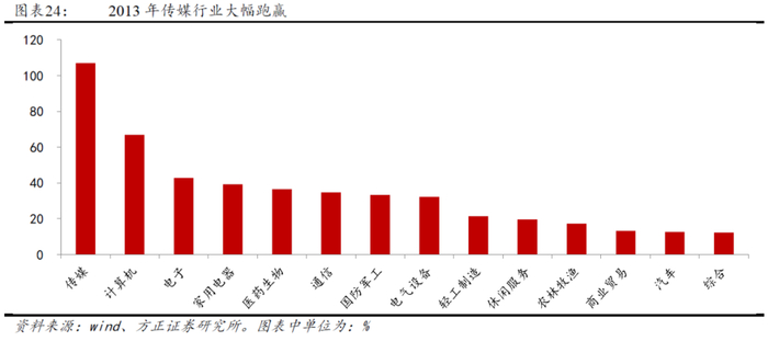 “钱荒”进一步强化了成长风格,领涨品种从传媒向计算机、电子等其他成长行业扩散。从领涨行业来看,全年传媒、计算机、电子表现抢眼,分别上涨107.02%、66.94%及42.78%。分阶段来看,第一次“钱荒”之前,传媒行业领涨市场,涨幅达43.38%,其他成长子行业表现相对平淡。在6月初第一次“钱荒”从初露端倪到逐步发展到顶峰的半个月内,创业板保持强势,抗跌属性明显,而主板则接连下挫,市场方向从此明晰。“钱荒”的短期冲击成为了成长板块的“试金石”,冲击过后,成长风格的相对优势更加明确,领涨的子行业也从传媒向计算机、电子、通信、国防军工、电气设备等所有成长行业扩散。