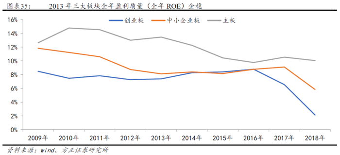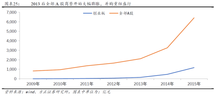 互联网重塑商业模式及投资模式,轻资产与外延并购开始深入人心。伴随着经济转型呼声渐高与互联网的深入普及,以轻资产和外延式并购为核心的商业模式开始受到市场追捧,特别是《泰囧》、《致青春》等一系列电影及手游的爆发使得“流量”概念开始火爆,炒流量,炒票房,炒流水的模式出现,传媒股、游戏股涨幅惊人,传统的资产定价模式开始出现分支,市场偏向于给与互联网概念以及轻资产模式的成长股更高溢价。其次是IPO暂停后,一级市场融资路径被冻结,但同时定增重组放开,一二级市场联动通过上市公司的并购重组实现,一级市场投资者通过被上市公司收购实现退出,二级市场企业通过购入相对低估值的资产获得估值溢价,进一步推高市值,形成大量商誉。特别是创业板,新形成的商誉占全部A股比重由2012年的10.22%单年快速提升至19.46%。叠加经济波动消失,传统以经济周期和资产重估为代表的投资框架受到挑战。