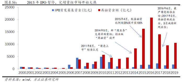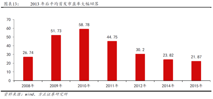 股市IPO的停发与重启间接助力存量资金风险偏好的提升。2012年经济加速下行,股市大跌。除基本面因素外,一级市场IPO占有资金巨大,抽血效应明显导致二级市场低迷的论调甚嚣尘上。郭树清主席上台后对于IPO进行了两项调整,一是发行市盈率不得超过同行业上市公司市盈率,二是叫停IPO,IPO于2012年10月正式停止,2014年1月重启。从历史上多次的IPO暂停前后的市场走势来看,IPO暂停不足以改变市场走向,但本次IPO暂停对市场情绪起到了抚慰作用,暂停期间有助于场内资金风险偏好的提升。同时,本次IPO改革重塑了此后的IPO定价机制。一级市场的平均首发市盈率由2011年、2012年的44.75倍及30.20倍降至2014年及2015年的23.82倍及21.87倍,客观上的资金分流效应减弱。
