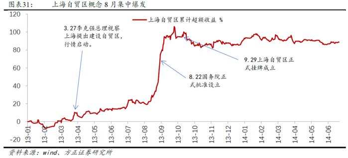 下半年风险偏好显著提升,成长风格同时向主题投资扩散。随着全市场风险偏好的抬升,成长风格也向主题热点进一步扩散,下半年进入主题投资重要机遇期,其中以上海自贸区最为典型,上海自贸区首发效应明显且累计超额收益巨大。自贸区行情启动以2013年3月27 李克强总理考察上海并首次提出建设自贸区为标志性事件,此后市场经历了四个月的政策学习和解读期,区间累计超额收益15.30%。下半年,随着相关政策的落地,八月行情开始集中爆发,行情持续时间为一个半月,区间累计超额收益高达84.63%,资本市场对上海自贸区上升为国家战略表现出极大的热情和认可,十一后挂牌落地行情结束。上海自贸区作为全国第一个自贸试验区,涨幅始终位列各自贸区版块首位,自提出以来相对沪深300指数的累计超额收益达126%。全年来看,中信成长风格指数全年上涨40.62%,而“钱荒”后的下半年上涨29.29%,占全年涨幅的72.13%。尽管创业板下半年的涨幅不及上半年,但多数成长子行业涨幅由第二轮上涨贡献。