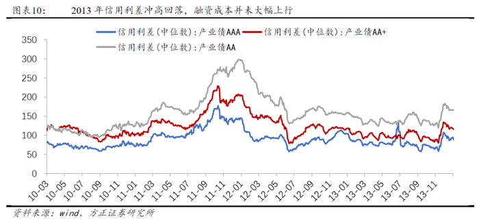 “钱荒”形成了短期流动性扰动,流动性管理主要作用于银行间市场,融资成本并未实质性大幅走高。事后来看,虽然2013年整体的流动性是中性偏紧的,但收紧货币政策的目的以压缩影子银行,清理非标业务为主,整体政策目标偏结构性,主要作用于银行间市场,与常规经济周期中通过货币政策收缩来抑制经济过热有本质区别。因此,各评级的信用利差在第一次钱荒前都呈现出缓慢下行的态势,钱荒导致短暂冲高后再次步入下行区间。由于2013年我国债券市场并未出现过实质性违约,信用利差以表征流动性风险为主,从这一角度来看,2013年的流动性收紧对实体经济的融资成本扰动并不明显,且主要作用于银行间市场,年初与年末的信用利差持平,融资成本与2012年底流动性宽裕时走平,并未实质性走高。