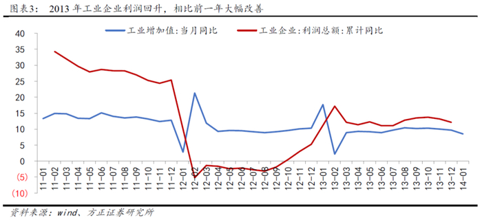 2013年经济结束快速下行,阶段性企稳,经济的回暖为成长股创造了良好宏观环境。经过2012年的新一轮刺激,经济在2013年结束快速下行趋势,阶段性企稳,全年实现7.8%的GDP增速,仅比2012年小幅下降0.1%,经济增长7.5%—8%的新中枢确立,且全年通胀并未持续走高,通胀无虞。经济在下行过程中的放缓或者企稳对于成长股具有重要的指示意义,其一,经济企稳自然而然的体现到上市公司的企业盈利回升上,2013年全年工业企业利润总额同比增速1.5%,相比2012年回升0.7个百分点,与之相对应的全部A股盈利质量都得到修复,而成长股的业绩弹性更强,改善更为明显。其二,经济快速下滑的结束意味着防御姿态与底线思维的逐步松绑,此时,股票市场由给与确定性溢价向给与弹性溢价过渡,成长股的估值弹性优势在经济企稳的宏观环境下得到体现。