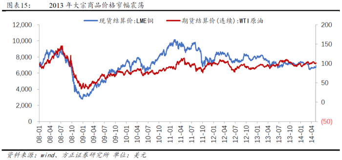 大宗商品价格呈现震荡格局。2013年全球经济表现为温和回升,总需求相对于2009年及2010年没有明显放大,以铜和原油为代表的大宗商品价格整体呈现震荡格局,周期板块及能源品并没有明确的趋势。