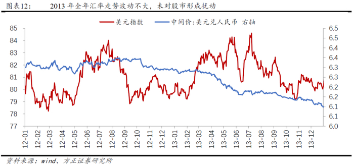 汇市窄幅波动,并未对股市形成大的扰动。2013年人民币全年兑美元小幅升值2.91%,从年初的6.23升至年底的6.05。分阶段来看,1-2月,人民币对美元汇率即期价格小幅走贬。3-5月,人民币对美元中间价连续高开,带动即期价格上升,从6.24升值至6.12。6-9月底,外管局下发的20号文以及由此导致的新增外汇占款的下降,降低了人民币升值压力,加上美联储明确了退出量化宽松政策的路线图,人民币对美元汇率回稳,波动区间在6.11-6.15。10-12月份,中国贸易顺差明显增加,人民币从6.12升值至6.05,特点是阶梯性升值。全年全球经济都呈现了趋稳态势,尽管有QE扰动,但汇市整体波动不大,并未对股市形成大的冲击。