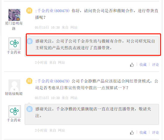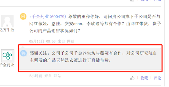 千金药业在互动平台表示,公司子公司千金养生坊与薇娅有合作,对公司研究院自主研发的产品天然洗衣液进行了直播带货。此外,公司还表示,公司的千金净雅在天猫旗舰店一直在直播带货。