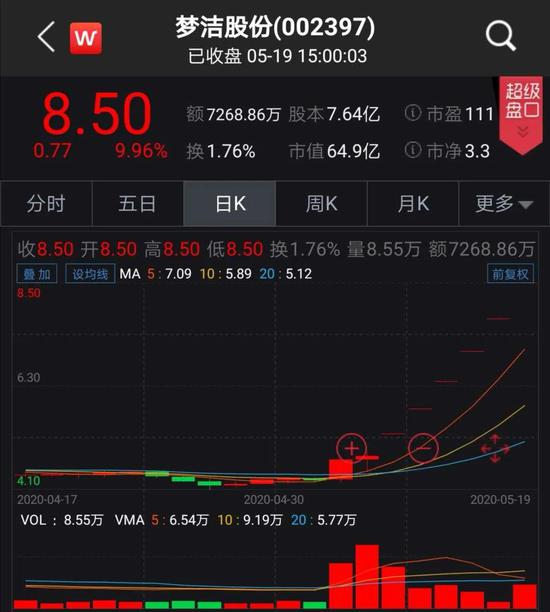 今日,另一个网红带火概念股梦洁股份继续一字涨停,股价收于8.5元/股,涨幅9.96%。从5月12日薇娅引爆涨停后,梦洁股份股价已经连续6个一字涨停,股价暴涨77.08%,总市值为64.95亿元,市值暴增28.27亿元。