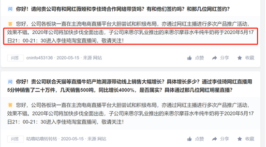 在5月15日,皇氏集团就在互动易平台透露,子公司来思尔乳业推出的来思尔摩菲水牛纯牛奶将于5月17日21:00-21:30进入李佳琦淘宝直播间,当日皇氏集团的股价大涨7.32%,当天以6.45元/股收盘,此前公司股价已经大涨两天,不过此后两天股价回落。