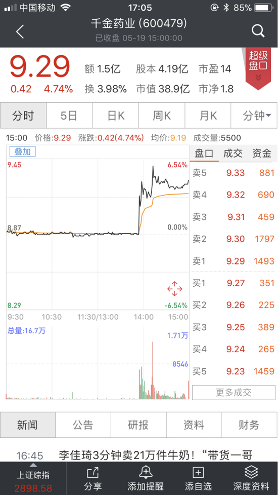 走势平平的千金药业午后突然拉升,最终收于9.29元/股,涨幅4.74%。