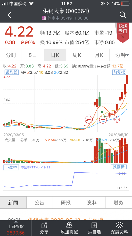 今年2月4日,供销大集股价跌至1.8元/股创出新低。到4月20日,供销大集今年的行情启动,曾在4月21日至27日连拉5个涨停板,之后三个交易日大幅下跌。4月20日至今,供销大集涨幅为118.65%,股价从最低1.91元/股涨到4.22元/股,翻了一倍还多。