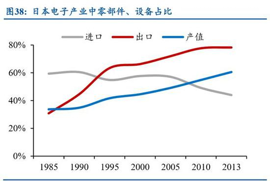 零部件与设备成为出口创汇主力。1985 年之后日本电子制造业中零部件与设备 的产值占比持续提升,从 1985 年的 30%提升到 2013 年的 60%,出口创收占比更是 从不到 30%提升到接近 80%,同时占电子行业进口额的比重持续下降到 40%,说明 日本本土零部件与设备厂商的竞争力不断提升,不光实现了实现进口替代,更是成 为了出口创汇的主力产业。