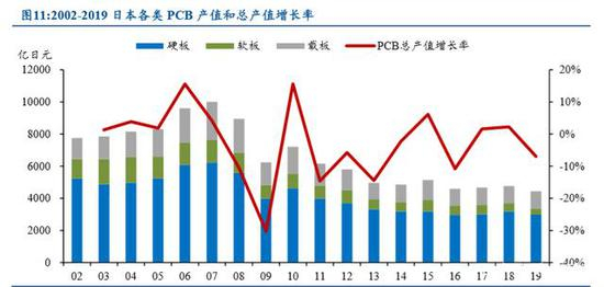 日本 PCB 产值中硬板占比最大, 各类 PCB 产品产值均在下滑。2019 年日本 PCB 总产值为 4438 亿日元,同比上年下降 7%,其中硬板产值为 2983.51 亿日元, 占 PCB 总产值 67%,同比下降 6.50%。从 2002 年到 2019 年整体来看,日本 PCB 产 值不断下滑,年复合增长率为-3.33%,其中硬板复合增长率为-3.25%,软板为-6.78%, 载板为-1.07%。