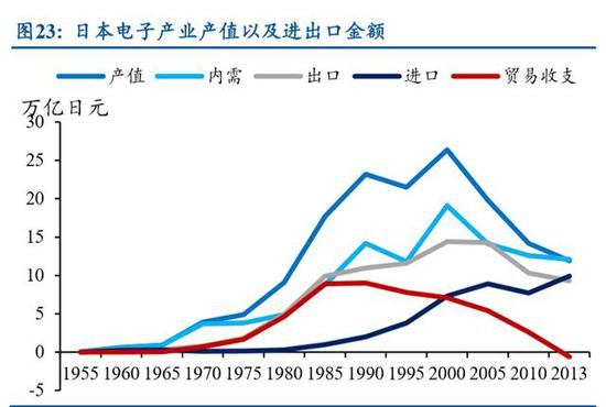 经过战后初期的复苏,日本电子制造业迎来了真正腾飞的30年。30多年的时间, 其产值从 1955 年的 0.02 万亿日元增长到 1985 年的 17.7 万亿日元,同期出口产值从 近乎为 0 增长到 9.9 万亿日元,贸易收支方面, 1955 年为贸易逆差发展到 1985 年 顺差 8.92 万亿日元,同期日本整体贸易顺差 10.87 万亿,电子制造业贡献了其中的 82%,足以证明到 1985 年电子制造业已经成为日本的支柱产业。