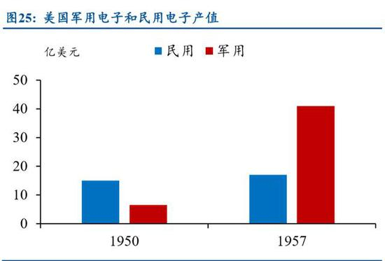 一方面是军用订单的刺激,另一方面在民用电子领域日本趁势壮大。因为在二 战期间美国主要生产军用订单,所以靠进口才能满足民用电子订单的需求。1950 年 美国电子产业中民用电子产值为 15 亿美元,军用电子产值为 6.5 亿美元,然而 1957 年却逆转为 17 和 41 亿美元,美国产业政策的此次改变给日本民用电子产品进入美 国市场创造了条件。
