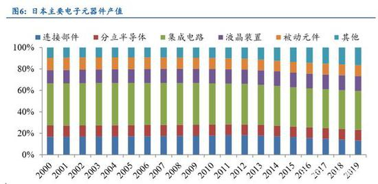 日本的电子元器件主要由集成电路、液晶装置、被动元件、分立半导体和连接 部件组成,其中 2019 年集成电路、液晶装置、被动元件在日本电子元器件产值中占 比分别为36.25%、13.92%和10.21%,分立半导体和连接部件也达到了9.95%、13.24%。