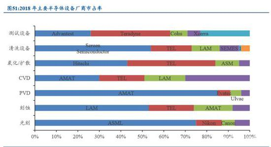 即使在发展水平相对较高的 IC 封装测试领域,我国与先进国际水平相比仍然 存在较大差距。尤其是单晶炉、氧化炉、 CVD 设备、磁控溅射镀膜设备、 CMP 设 备、光刻机、涂布/显影设备、 ICP 等离子体刻蚀系统、探针台等设备市场几乎被国 外企业所占据。