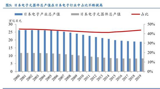 日本电子元器件总产值在整个日本电子行业中占比上升。日本电子元器件在日 本电子工业中占有重要地位,2019 年电子元器件产值达到 8.27 万亿日元,约占日本 电子行业总产值的 43.78%,且这一比例在过去十年时间里呈不断上升趋势的。