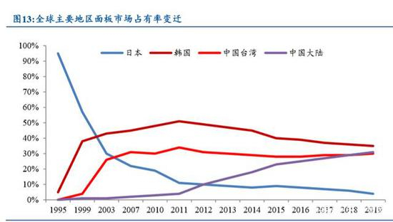 面板产业开始向中国转移,日本厂商逐渐衰落。1988 年,夏普推出了世界第一 台 14 英寸液晶显示器,这让日本几乎垄断了世界液晶面板产业,在 1990 年-1994 年, 日本在全球液晶面板产业的份额占比高达 90%-94%以上。随着韩国实行集中国家力 量进行超强投入进行创新的策略,韩国液晶面板逐渐实现了对日本的赶超,韩国三 星和 LG 在显示面板领域全面超过日本。