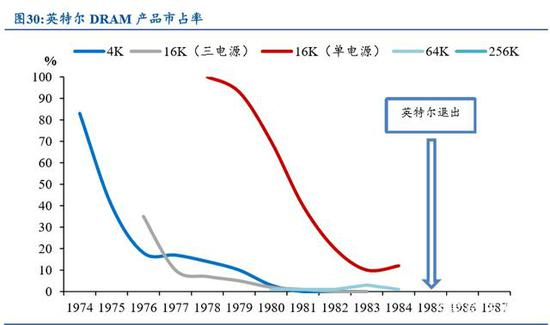 创新型模仿,日本 DRAM 成功的又一关键。英特尔当初凭借 4KB DRAM 抢占 了超过 80%的市场份额,日本公司纷纷效仿,导致英特尔的市占率急转直下。后来 英特尔研发了 16KB DRAM(三电源供电)和 64KB DRAM(三电源供电),然而由 于跟风者不断追进,英特尔很难持续垄断市场。于是英特尔在 1979 年推出杀手锏产 品:单电源供电的 16KB DRAM,日本公司根本无从下手,所以该款 DRAM 产品在 发售时获得 100%市占率,然而,竞争对手纷纷模仿英特尔开发单电源 DRAM 产品, 最终英特尔的市占率跌到 10%左右,最后英特尔决定退出 DRAM 行业。英特尔的退 出造就了日本 1985 年取得全球 80%的巅峰市占率。