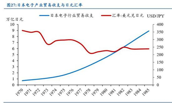 1970 年-1985 年电子行业出口大幅增长的同时日元的汇率在不断升值,日元兑美 元的汇率从期初的 360 升值到期末的 234,说明日本电子行业的出口并不是因为日元 汇率贬值所带动,相反,日本电子制造业公司需要不断降低成本以抵消日元升值带 来的下游国外客户采购成本上升。