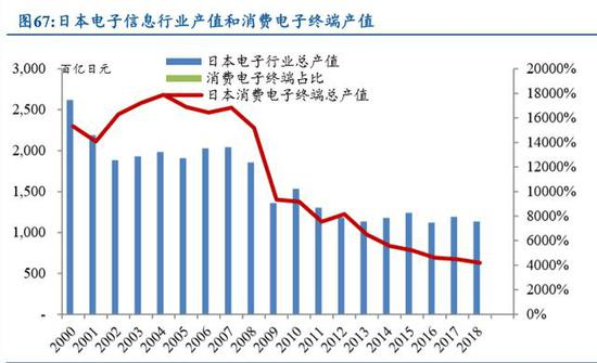 终端产品生产下降,零部件占比提升。参考当时日本的案例,日本电子制造业当中零部件的出口却一直处于上升态势,相对于终端产品需要大量的组装工序,零部件尤其是核心零部件的出口占比提升可以有效拉动日本电子制造业的毛利率水平。类似案例在电视机行业尤为显著,日本彩电行业在 1985 年之后出口锐减,但是日本 液晶显示屏的出口却日益增加,一直到 2003 年日本液晶面板占据了全球市场的 40% 以上。日本消费电子终端产品产值与行业总产值占比从 2000 年以来基本处于下降通 道,2019 年的比例已经不足 4%。