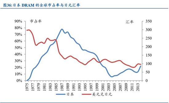 5)广场协定:日本 DRAM 成本优势不再的直接原因。尽管美国迫使日本签订 广场协定不是只针对半导体产业,但是不得不提广场协定对日本半导体的出口影响 是巨大的。1985 年 9 月,日元汇率在 1 美元兑 250 日元上下波动,在“广场协议” 生效后不到 3 个月的时间里,快速升值到 1 美元兑 200 日元附近,升幅 20%。1986 年底,1 美元兑 152 日元,1987 年最高达到 1 美元兑 120 日元。1985 年后日本电子 制造业的贸易顺差开始掉头向下,DRAM 产品的市场占有率也开始急剧下降,时间 点与广场协议签订时间高度相关。