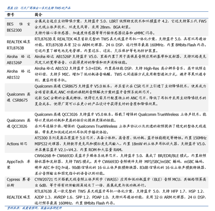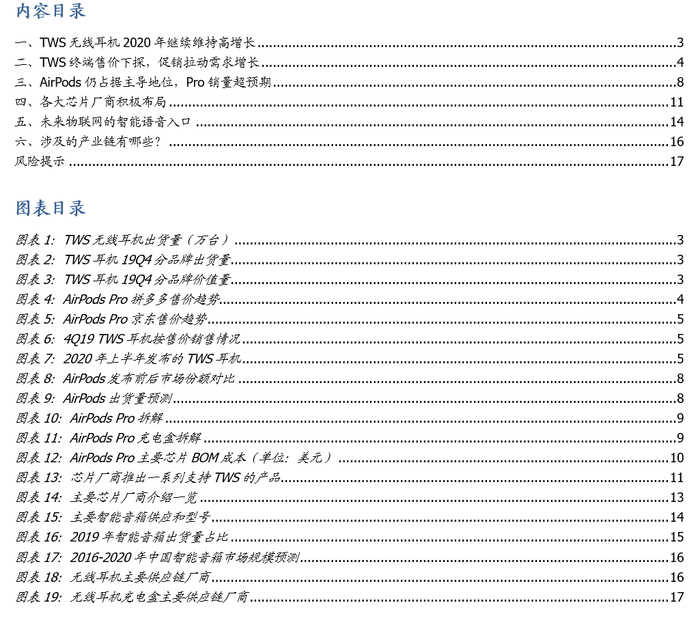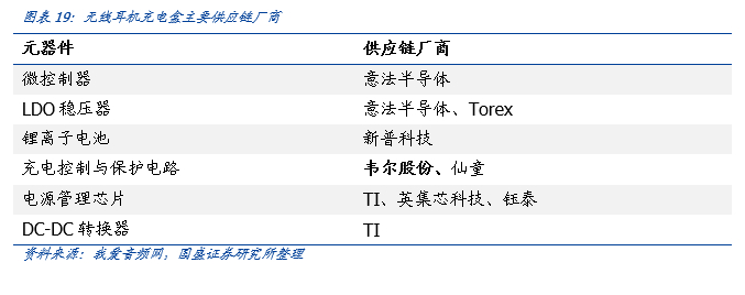 涉及的产业链有哪些?TWS的产业链主要包括ODM厂商,无线耳机的元器件厂商,其中包括主控芯片、存储芯片、FPC、语音加速感应器、MEMS、过流保护IC、电池等,涉及的ODM以及声学器件供应商包括立讯精密、歌尔股份、共达电声、瀛通通讯,芯片厂商包括恒玄、瑞昱、络达等;存储厂商包括兆易创新(Nor Flash)、Adesto;模拟IC厂商包括韦尔股份、圣邦股份、杰华特;充电盒电源管理芯片包括TI、钰泰,此外,欣旺达、鹏鼎控股以及一些中国台湾厂商例如耀华、华立捷等也将受益于TWS耳机市场的兴起。