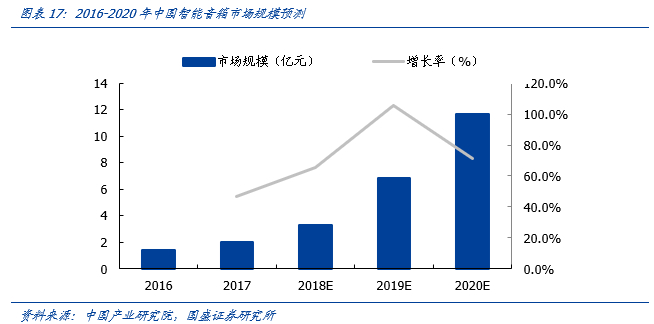 TWS蓝牙耳机+智能音箱,有望打开智能交互入口。智能音箱一直被视为智能家居入口,在家庭场景下,TWS耳机可以作为声音交互的辅助入口,形成智能音箱+TWS耳机入口闭环。根据中国产业研究院统计分析,中国智能音箱市场规模呈现上升趋势,预计在2020年将达到11.6亿元,2016年至2020年间同比增长率为46.8%~105.6%。在未来的物联网世界,TWS耳机有望凭借其多场景应用,加入智能家居生态链,应用范围进一步拓展。