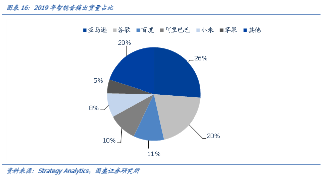 根据Strategy Analytics 的数据,2019 全球智能音箱出货量近 1.5 亿台,同比增长 70%,创历史新高。19Q4智能音箱的厂商排名亚马逊仍然稳居第一,市场份额为26.2%。谷歌则以 20.3% 的市场份额保持第二名,百度、阿里巴巴、小米都增加了市场份额,分别为 10.6%,9.8%,8.4%。苹果以 4.7% 的市场份额位居第六。