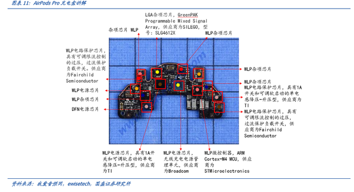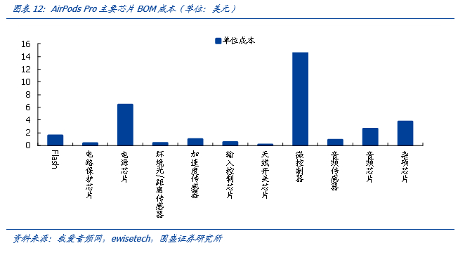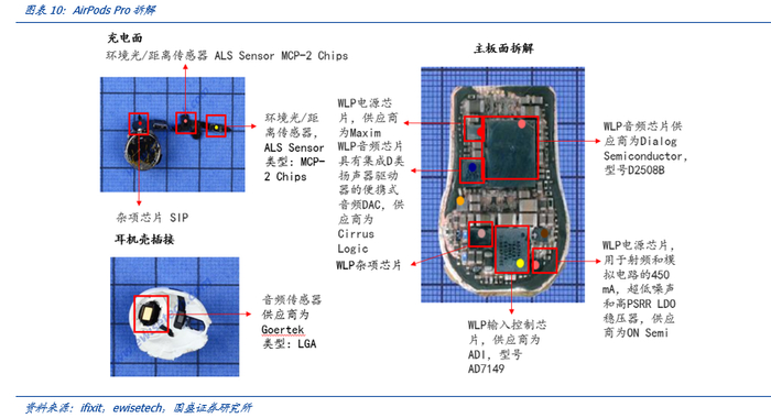 每一台Airpods的设计和芯片数都是一样的。在两个耳塞内部以及充电盒的主要IC组件及其BOM成本如下图所示: