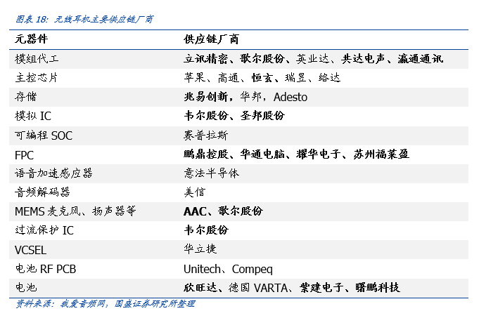 TWS的产业链主要包括ODM厂商,无线耳机的元器件厂商,其中包括主控芯片、存储芯片、FPC、语音加速感应器、MEMS、过流保护IC、电池等,涉及的ODM以及声学器件供应商包括立讯精密、歌尔股份、共达电声、瀛通通讯,芯片厂商包括恒玄、瑞昱、络达等;存储厂商包括兆易创新(Nor Flash)、Adesto;模拟IC厂商包括韦尔股份、圣邦股份、杰华特;充电盒电源管理芯片包括TI、钰泰,此外,欣旺达、鹏鼎控股以及一些中国台湾厂商例如耀华、华立捷等也将受益于TWS耳机市场的兴起。