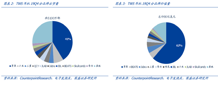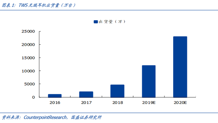 CounterpointResearch预测,2020年TWS无线耳机的出货量将达到2.3亿副,相对于2019年仍然继续维持翻倍的增长。随着蓝牙技术的升级、3.5mm耳机孔的取消以及TWS耳机体验感的提升,未来TWS耳机市场前景广阔。