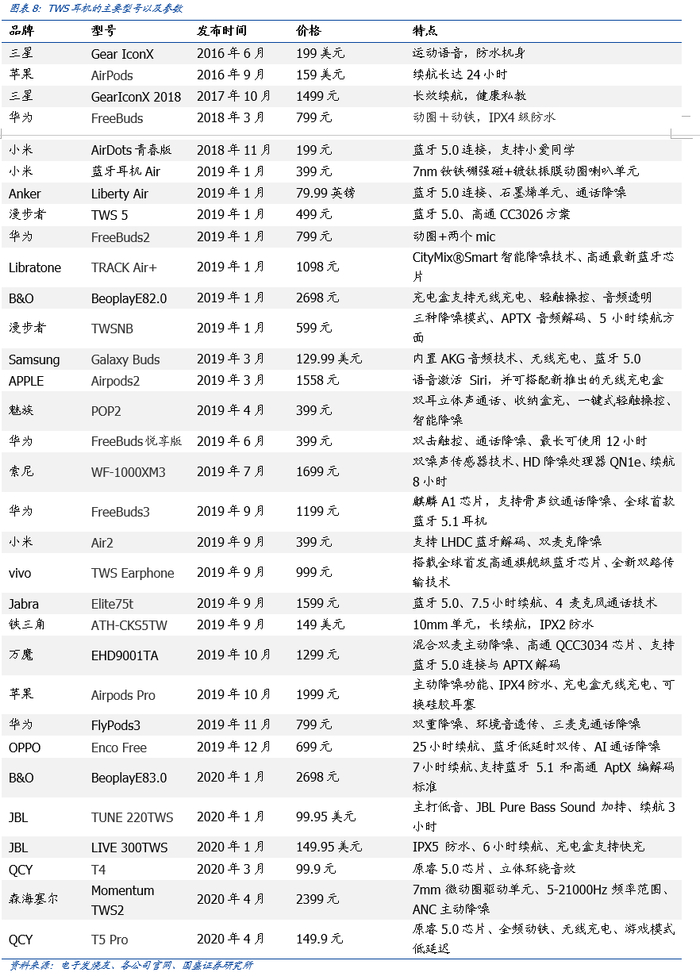 TWS终端售价下探,促销拉动需求增长。各大电商平台对TWS耳机进行了大力促销以拉动整体需求。2月27日,拼多多宣布上线为期三天的“百亿补贴节”,例如Airpods Pro等火爆产品拼多多只要1699元,促销活动上线后一度紧急补货五次。截至2月27日中午12点,已累计售出25000件AirPods Pro。同时5月25日,在苏宁易购618的云发布会上,苏宁宣布启动“J-10%省钱计划”、“千百万爆款计划”在内的优惠促销力度,以AirPods二代为例,京东到手价999元,苏宁每天10点、15点、20点限量抢179元券,到手价仅需799元。我们认为随着后续各大平台618等促销的临近,TWS耳机的销量将再掀浪潮。通过统计今年年初至今发布的TWS耳机,我们发现TWS耳机的售价逐渐下探。苹果 的AirPods 主打高端市场,售价均为千元以上,华为、小米、漫步者等厂商的 TWS 耳机价格覆盖了不同价格段位。例如漫步者TWS NB2蓝牙降噪耳机,预售时间为5月31日20:30—6月8日23:30,预售到手价仅为499元。小米的TWS主打性价比,Redmi AirDots S仅需99.9元。
