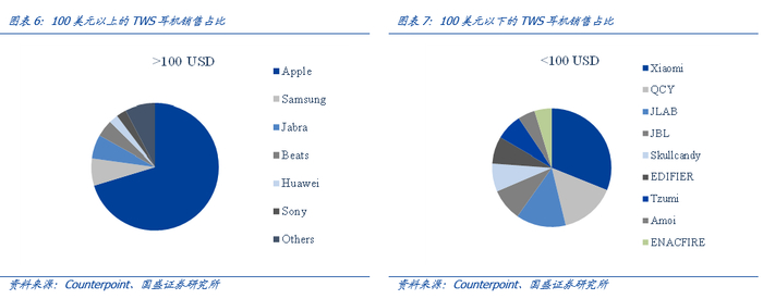 根据counterpoint的统计,售价100美元以上的TWS耳机中,苹果的销量份额超过70%,接下来包括三星、Jabra、Beats、华为和索尼;售价100美元以下的TWS耳机中,小米份额最高,其次为QCY、JLAB、Skullcandy、漫步者等。