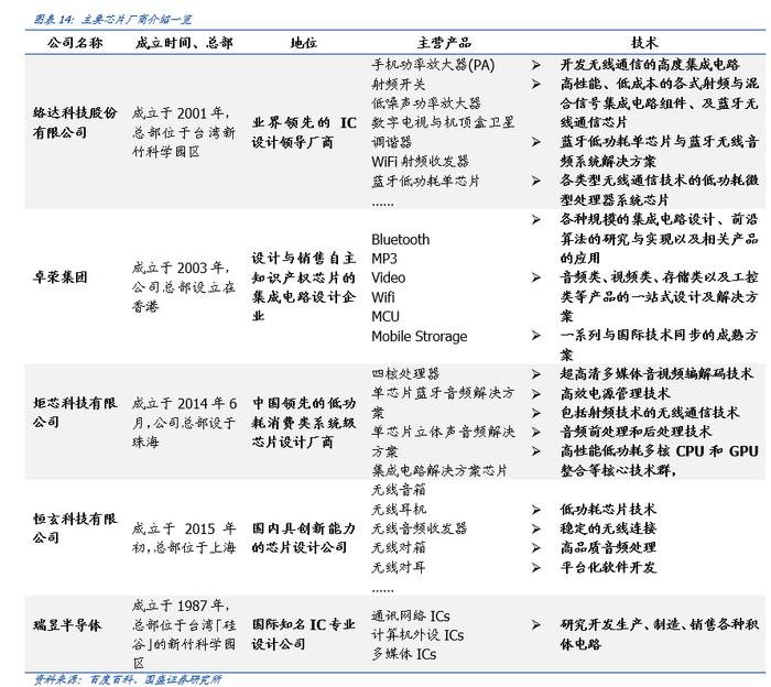 公司概况:络达科技成立于2001年,总部位于台湾新竹科学园区,是业界领先的IC 设计领导厂商。公司开发无线通信的高度集成电路,为客户提供高性能、低成本的各式射频与混合信号集成电路组件、及蓝牙无线通信芯片,提供具备各类型无线通信技术的低功耗微型处理器系统芯片,连接未来物联网世界中亿万个智能装置。