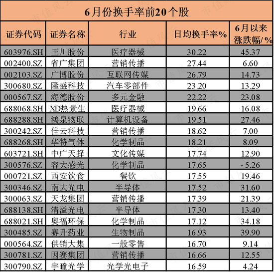 6月以来,营销传播、餐饮、半导体、医疗器械行业日均换手率占据前四,这些板块近期十分活跃,营销传播板块日均换手率超过8%。